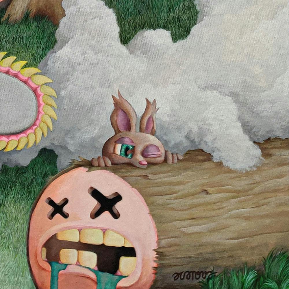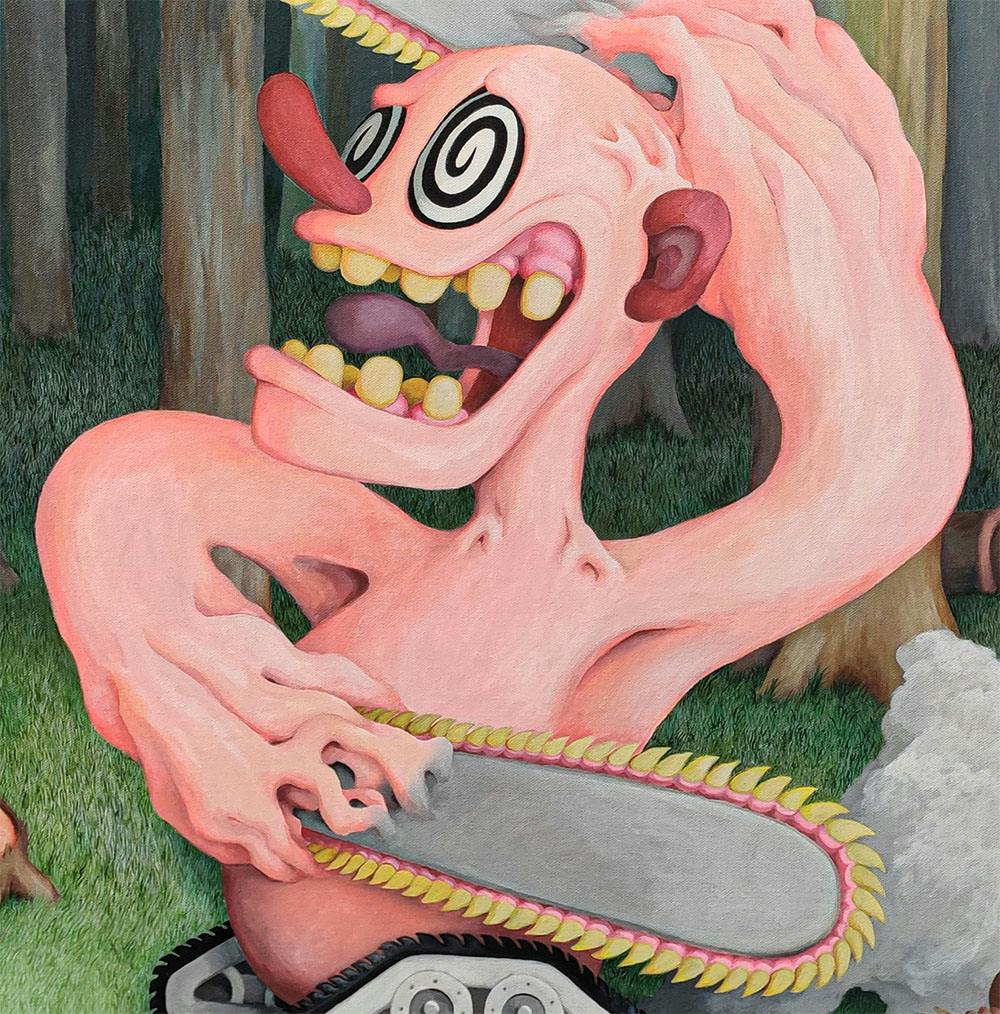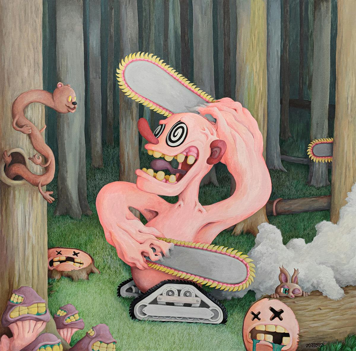 100x100 cm Acrylique sur toile /// Dans ce tableau, j’évoque la déforestation en jouant sur les contrastes. Dans cette mise en scène, la lumière induit la folie et derrière l’ombre se cache la vie.