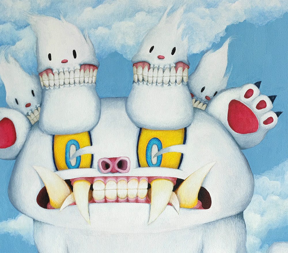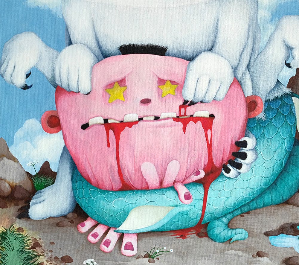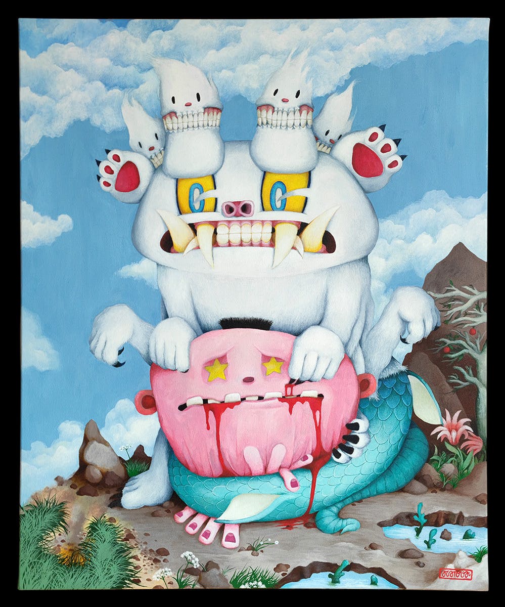 70x60 cm Acrylique sur toile /// La chimère est toujours un reflet de problèmes de société réels. Elle est ici inspirée de celles qu'on peut trouver en Asie. Elle se forme comme un mélange de légendes urbaines et de religion, véhiculant une philosophie en utilisant la métaphore. La chimère symbolise le détournement de son héritage et la force de pression qu'elle peut représenter.
